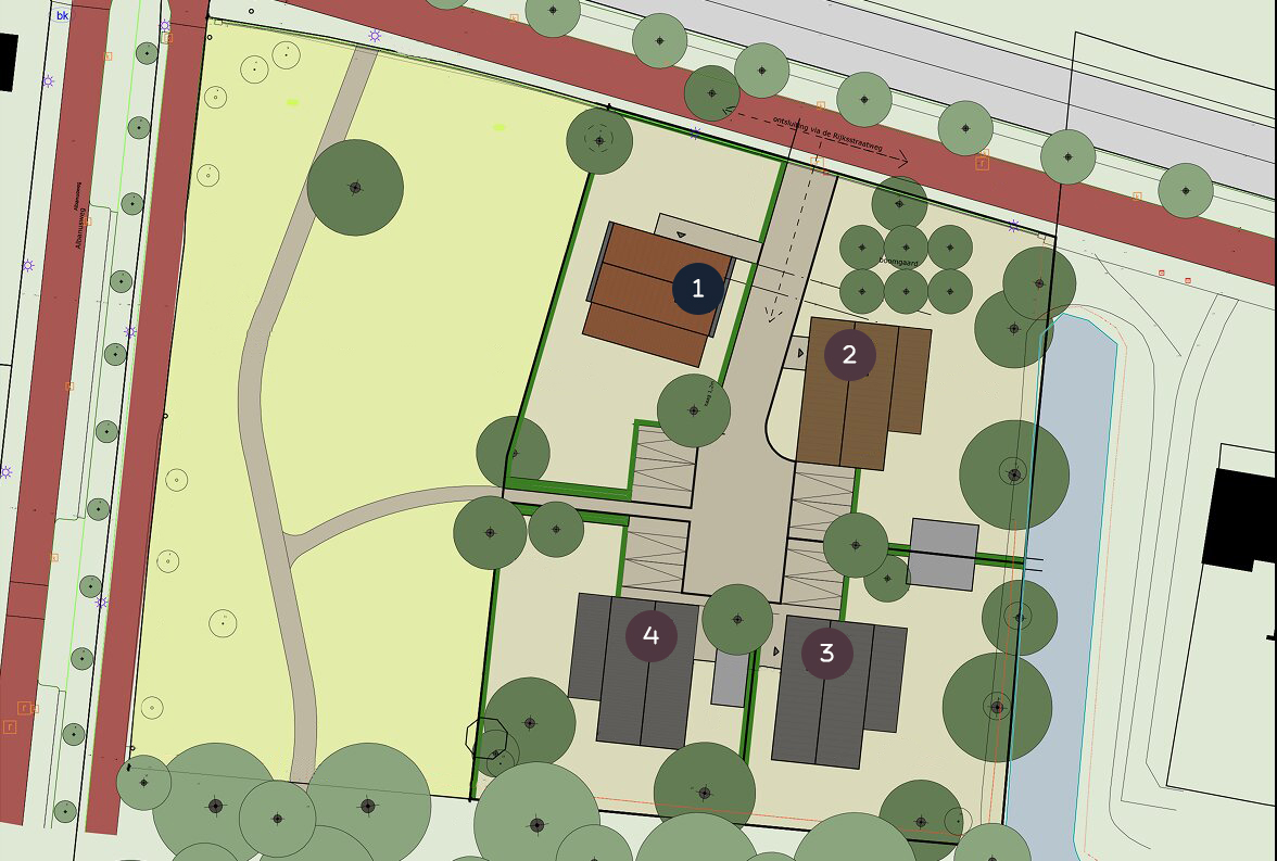 - Kaveloppervlakte: kavel 2 ca. 802 m² | kavel 3 ca. 635 m² | kavel 4 ca. 628 m².